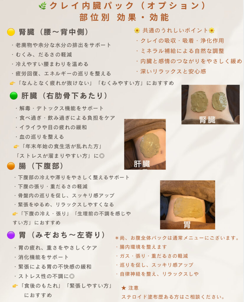 内臓クレイパックの部位別効果効能をまとめましたので参考にしてくださいね✨