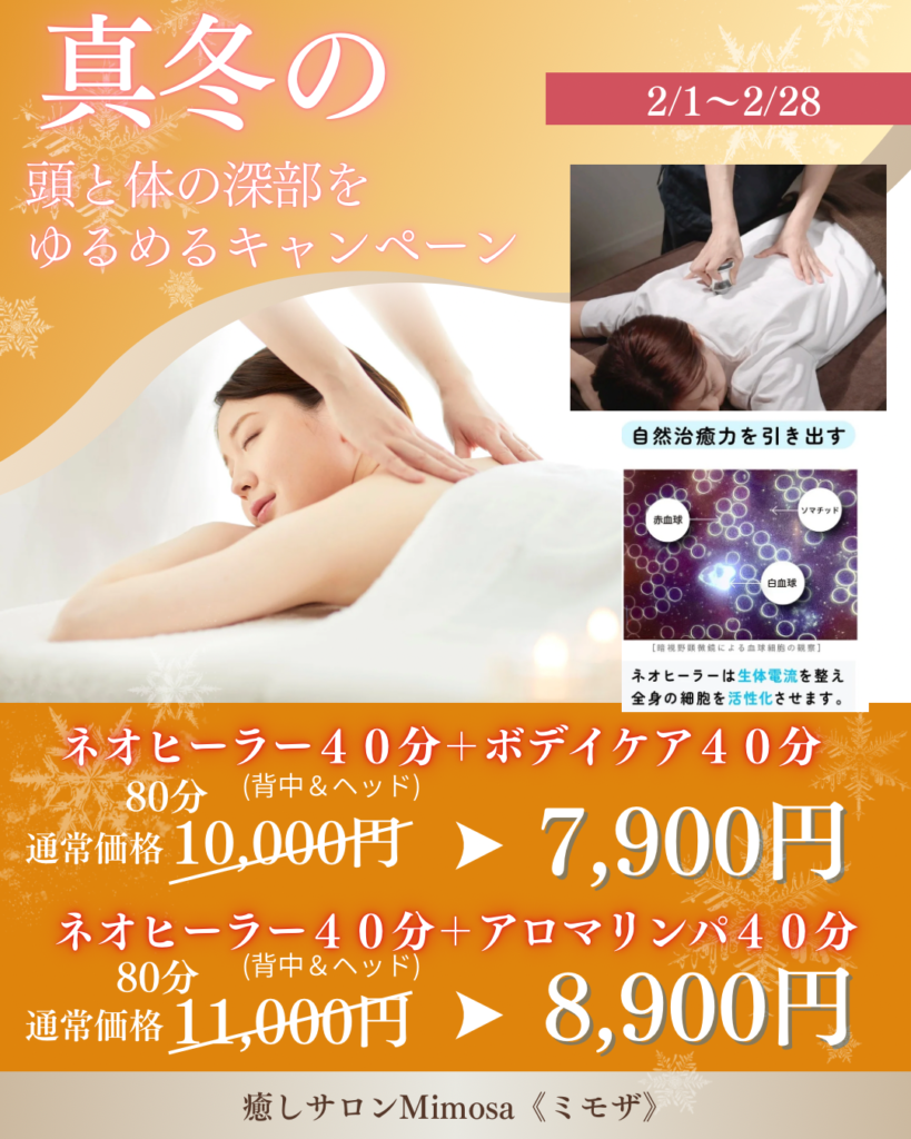 自律神経や生体電流のバランスを整える「ネオヒーラー」を使用した、2月限定の特別ケアです。